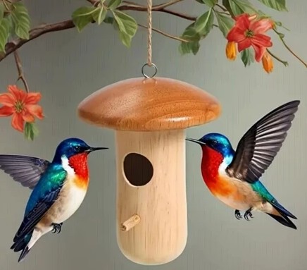 Casa de beija-flor de madeira maciça, ninhos em forma de cogumelo para exterior, decorações suspensas criativas, comedouros para animais de estimação, decorações de presente de jardim.