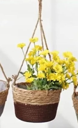 Vaso de Rattan de pendurar, trançado a mão, com forro plástico impermeável, para maior durabilidade.